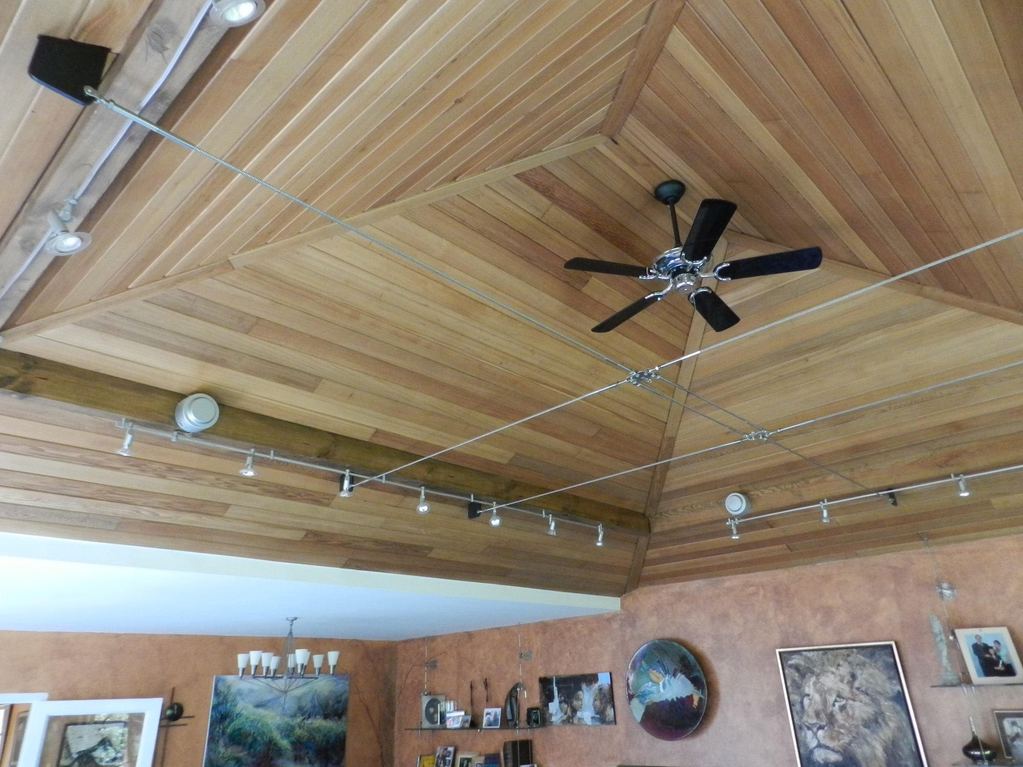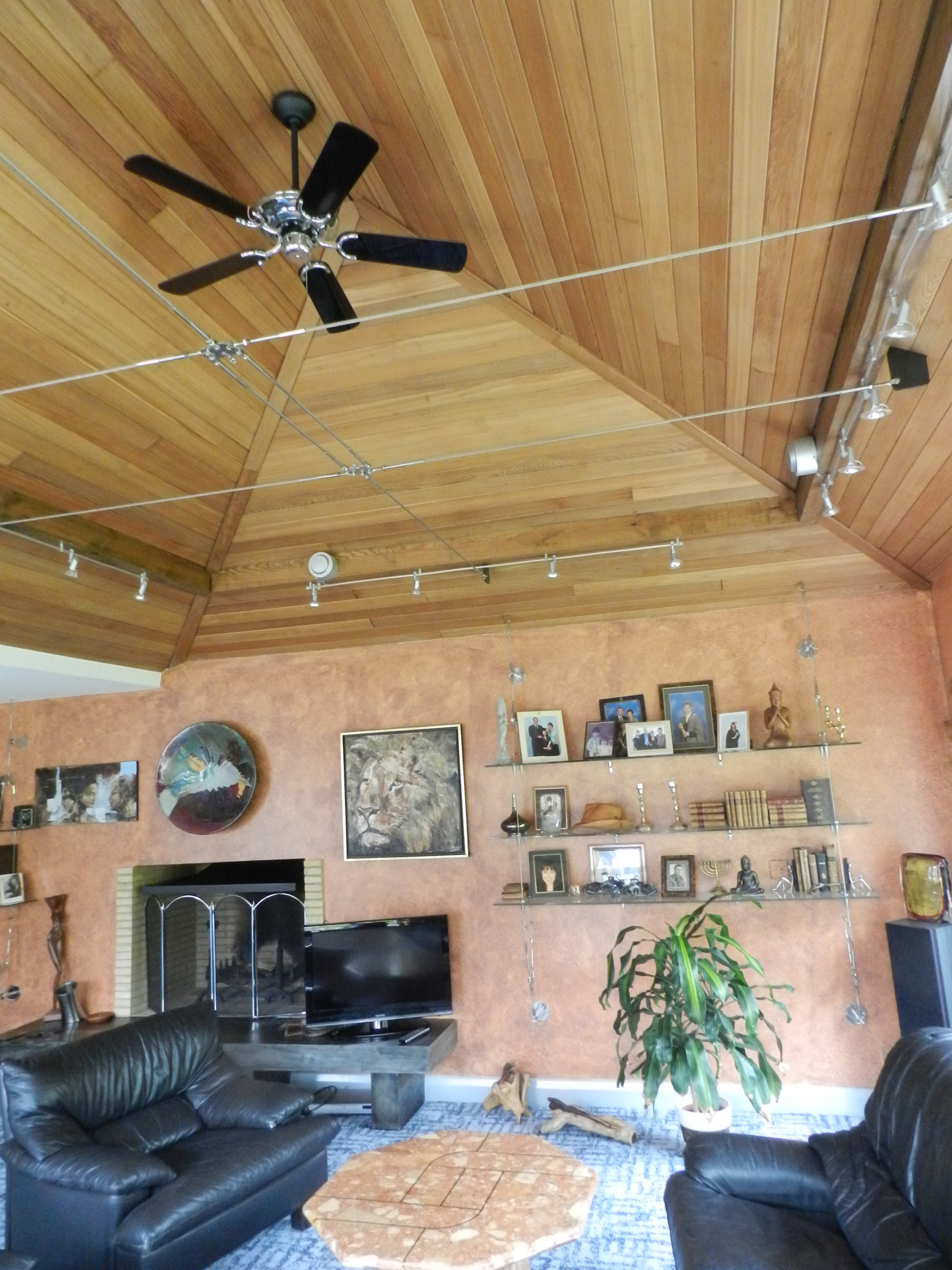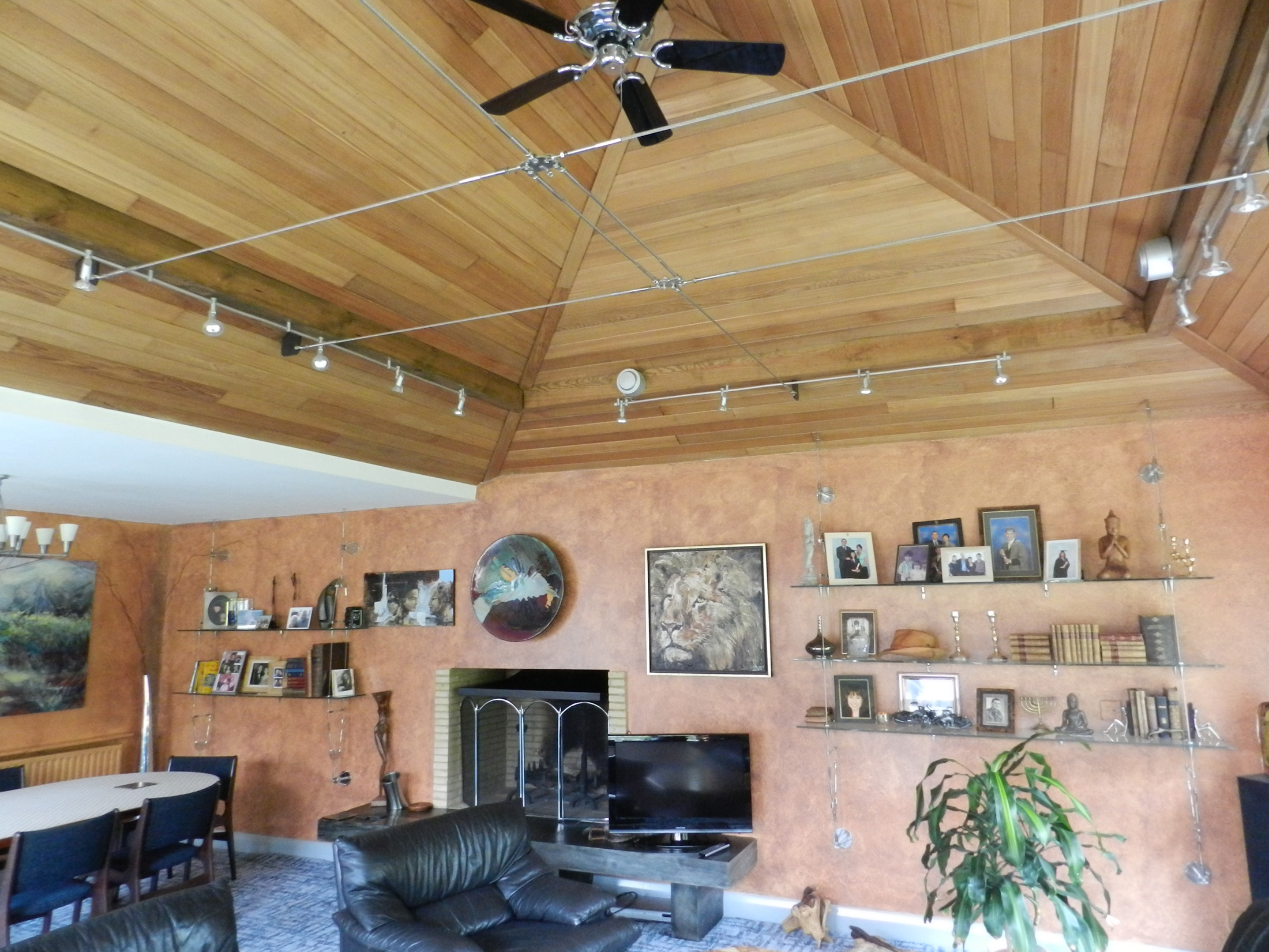 Special features included the cedar-lined pyramidal ceiling for the living room where lateral restraint was provided with a stainless steel cable suspension structure, and the new chimney and fire place, complete with solid slate hearth quarried specially by Delabole Slate.